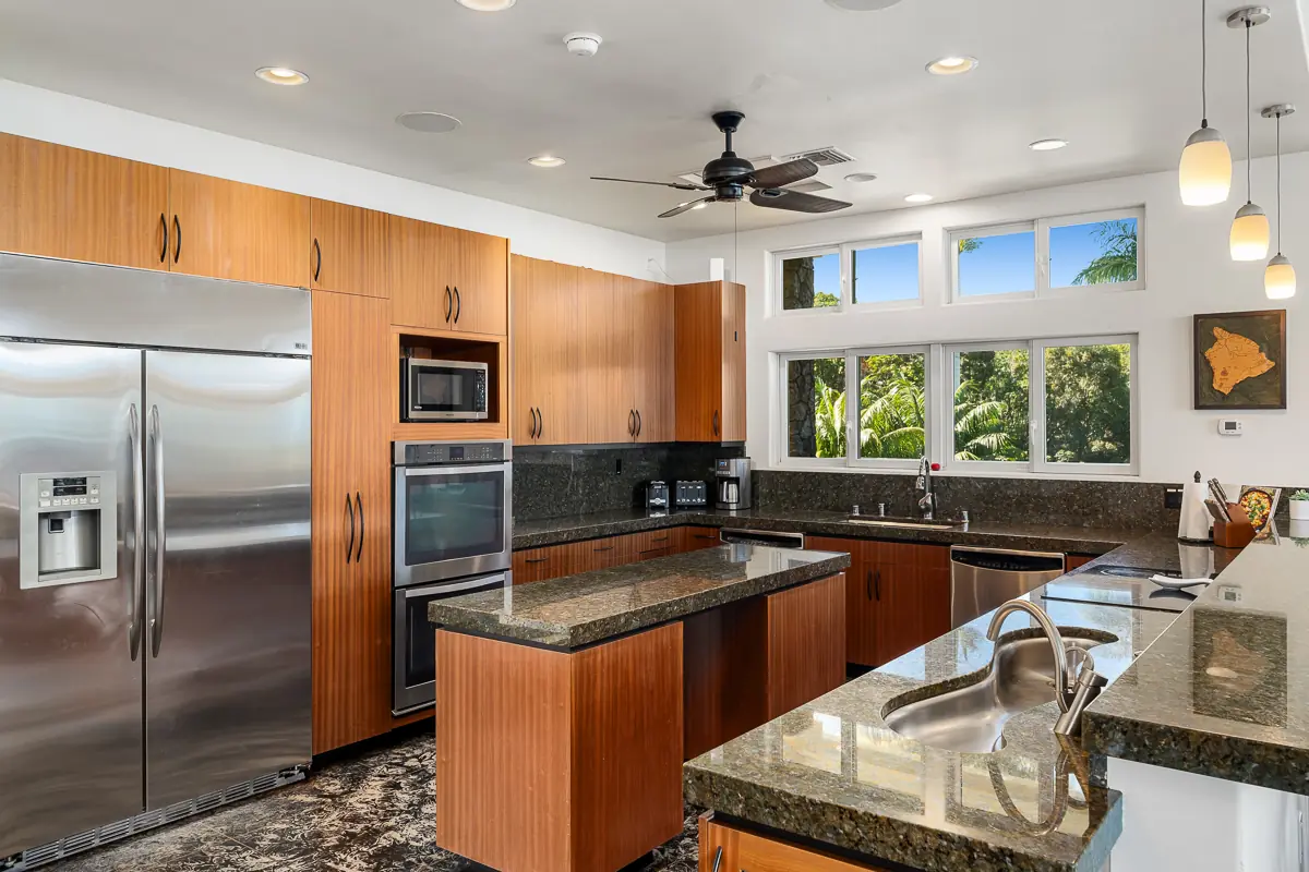 The grounds are lush and abundant, with rolling lawns, layered tropical gardens, and a producing orchard featuring coconuts, citrus, mango, lychee, longan, bananas, and more. The setting feels completely secluded, yet the conveniences of Hilo and nearby towns are within an easy drive, creating an ideal balance of retreat and accessibility.